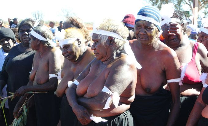 At the oval the message becomes even more intense: the women dancers, some of them very old, one of them on a walking frame, most of them bare breasted, have put white feathers in their hair. They come walking to the oval across a dusty, rubbish-strewn flat from their painting-up camp. Their dance is accompanied by their chanting which often and spontaneously changes into wailing.