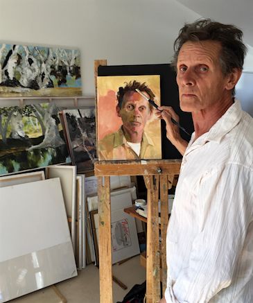 We can also see in this gathering in the gallery, where there are multiple portraits in which the same persons have participated – Smith and Valmai McDonald, for instance, Smith and Sue Grant, Smith and Smith – how the exchange is not exactly reproducible, that at each sitting something different occurs. Interestingly, the contrast is the sharpest in the two self-portraits, and I have wondered if that isn’t because Smith the painter had the upper hand, interrogating himself sternly in the one (below), but perhaps asking in the other (on the easel, top), which lands far more uncertainly, how well and far you can know yourself. The difference between the two is an expression of the contingency and unending process of knowledge, whether it is of self or others, whomever those others may be.