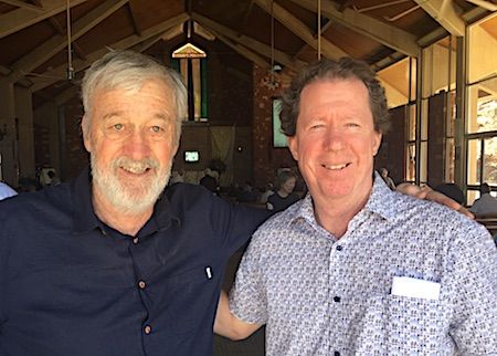 PHOTO: Michael Sitzler (at right) with former NT politician Peter Tyone in the Alice Springs Catholic church. Mr Toyne, now a full-time artist, assisted Kathleen Kemarre Wallace with the creation of the window above the altar.
