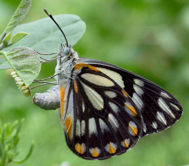 Each week I have to show restraint and choose images carefully. I’m trusting words alone to describe the pupa anxious to escape their chrysalis exoskeletons and begin life as butterflies. Equally, I know that most Centralian readers are familiar with the dark greenish black caterpillars with their bright yellow highlights. So this week I’ve selected two images possibly less familiar, one showing the female caper white laying her eggs beneath a leaf and the other a bit of whimsy. A bouquet for the Lorax I hear you ask?