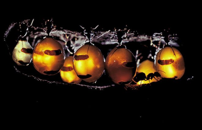 Several months earlier I’d located a honey ant nest and carefully excavated a section to capture a cohort of workers, and repletes. Following Densey and Jim’s example we built a plaster nest with various embedded conduits and glass panes that allowed back and sidelight to be introduced. Fibre optics gave us a cool lighting source with a measure of adjustment.