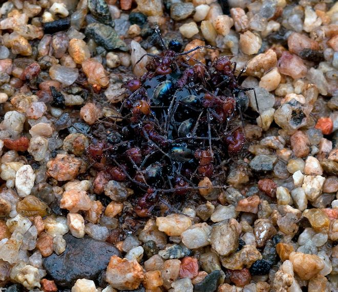 Choosing the hottest time of the day to forage, the high speed furnace ant, Melophorus bagoti is such an ant. This flame coloured species stores honey in the swollen bodies of modified worker ants, a contingency that sustains the colony when food is scarce.